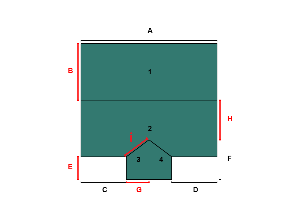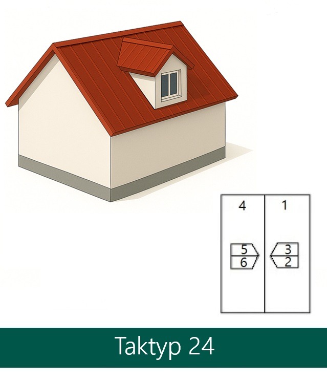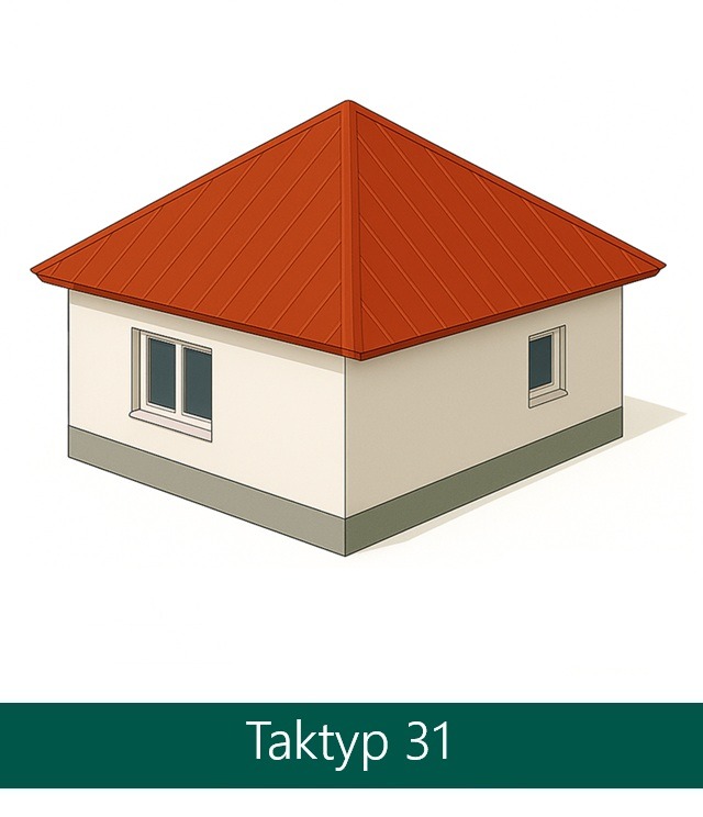 Taktyp 31 har mått A och B som avser takfotens bredd. Mått E, D, G och F avser måttet från högsta punkten ned till takfoten på de 4 olika fallen. Fallen är uppdelade i trianglar.