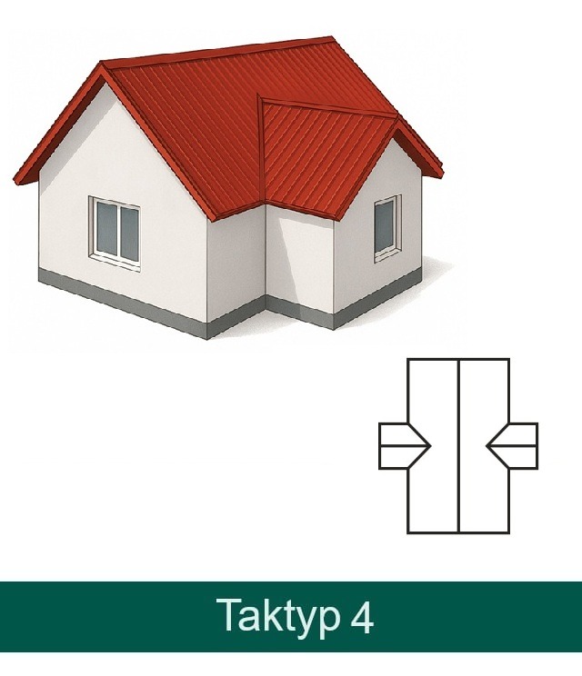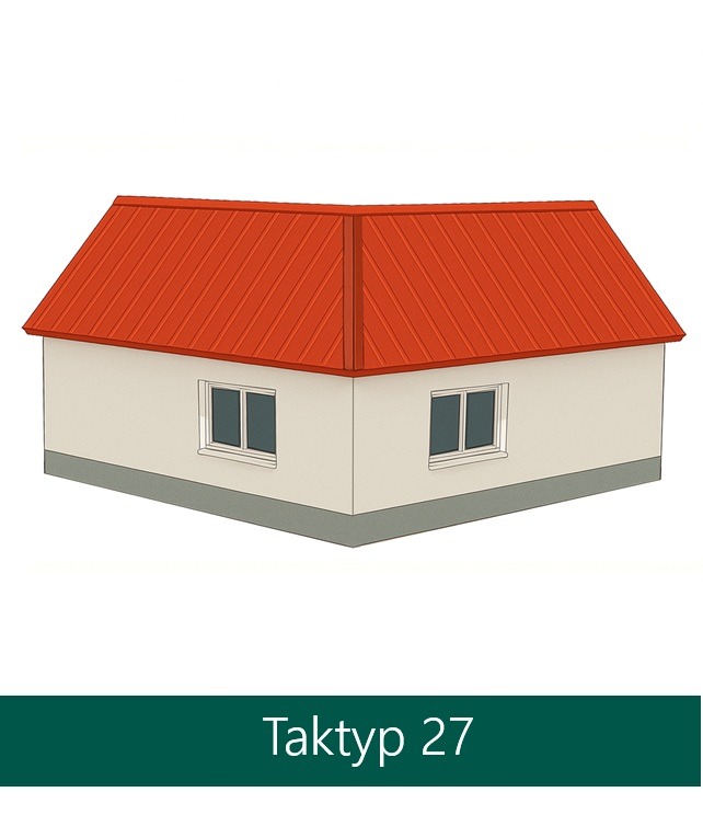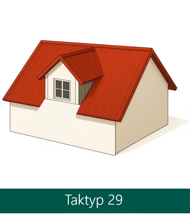 Taktyp 27 ansluter mot vägg vid A och D. Mått G avser hur lång nockplåten är vid övergången mellan de två taken.