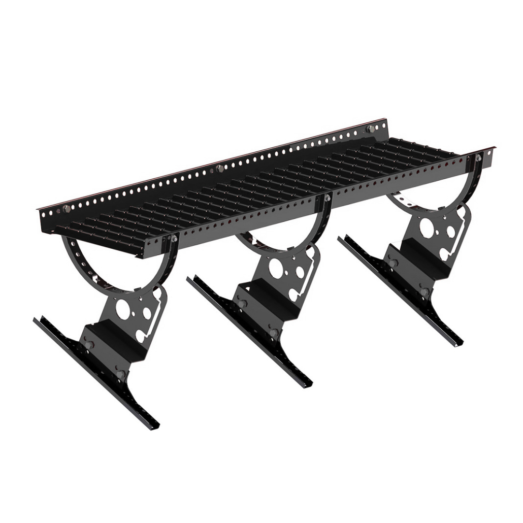 Svar: Gångbryggan monteras enkelt med konsoler som fästs i takets bärande underlag. Konsolerna nivåjusteras efter taklutningen för att säkerställa en stabil och vågrät installation. Det finns monteringsanvisning att följa för säkert fäste.