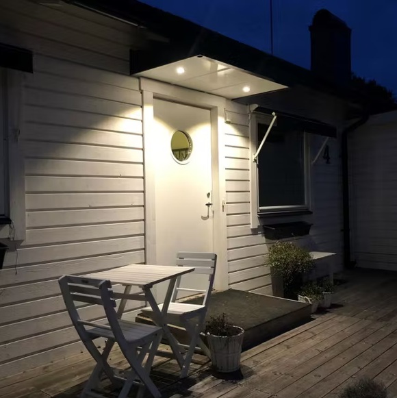 Om du vill förstärka entrékänslan kan du komplettera med infällda spotlights direkt i taket. Belysningen levereras i tre olika färgutföranden och ger ett välkomnande ljus samtidigt som den lyfter fasaden kvällstid.