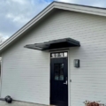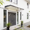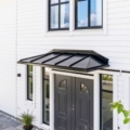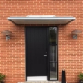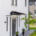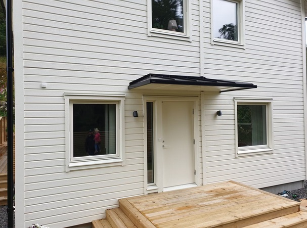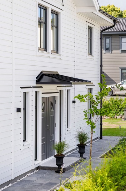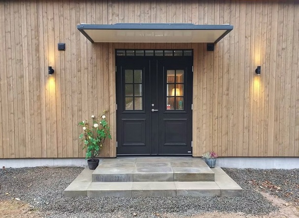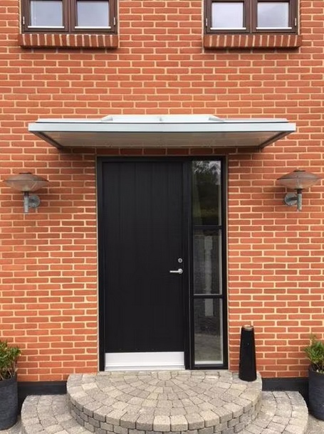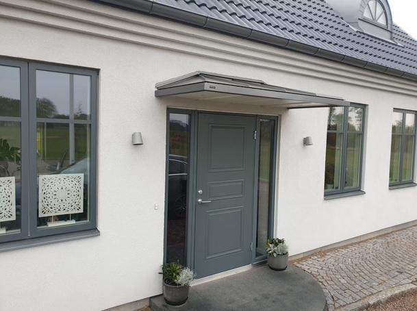 Det generösa djupet på cirka 1155 mm gör att taket effektivt skärmar av regn och snö framför dörren, något som märks extra väl vid utsatta lägen eller där många passerar in och ut. Stommen byggs av stabila aluminiumprofiler och takytan tillverkas i plåt av typen Plannja GreenCoat Glossy PRO BT, framtagen för att klara hårt nordiskt klimat under lång tid. Undersidan kan beställas antingen i samma kulör som ovansidan eller i en varmvit standardton, så att du enkelt kan matcha fasad, dörr och övriga detaljer runt entrén.