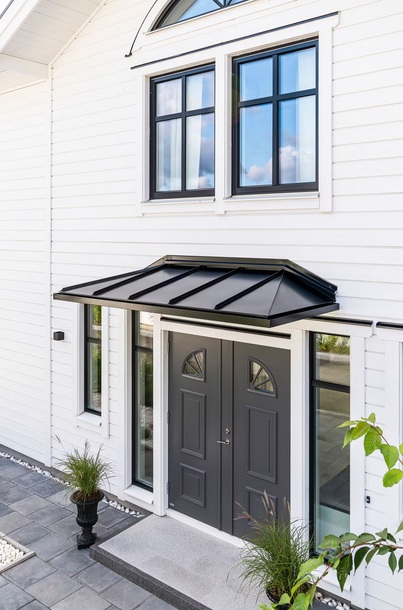 Entrétak Hipped Large är den rymligare varianten för dig som vill ha ett entrétak med rejält skydd och ett klassiskt, exklusivt utseende. Den karaktäristiska hipped-formen och den profilerade plåten ger entrén en tydlig karaktär och passar lika bra på representativa villor som på större bostadshus.