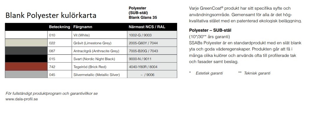 VP45 är en högre fasadprofil som lämpar sig för industrifasader. Priset kan skilja sig för de olika färgerna.