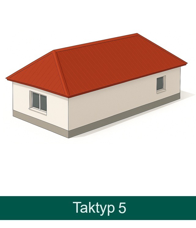 Sadeltak: halva husets bredd (nocklinje → vägg, horisontellt).
